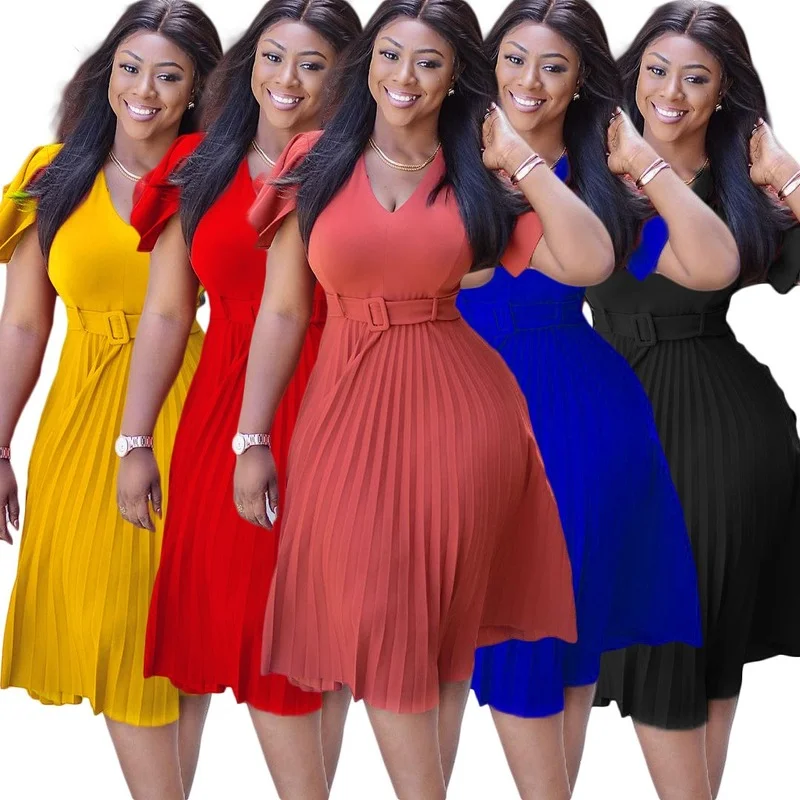 Summer Pleated Dress for Women Elegant Ladies Office Dress Ankara Dashiki Robe Slim Solid