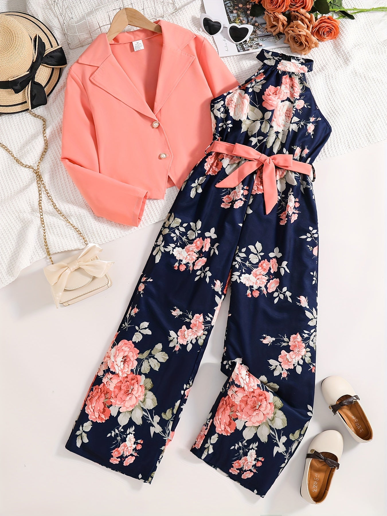 A charming two-piece outfit set designed for girls with an elegant seasonal look. Features a solid color cardigan paired with a floral print jumpsuit. Ideal for outdoor vacations and daily wear during spring and autumn.