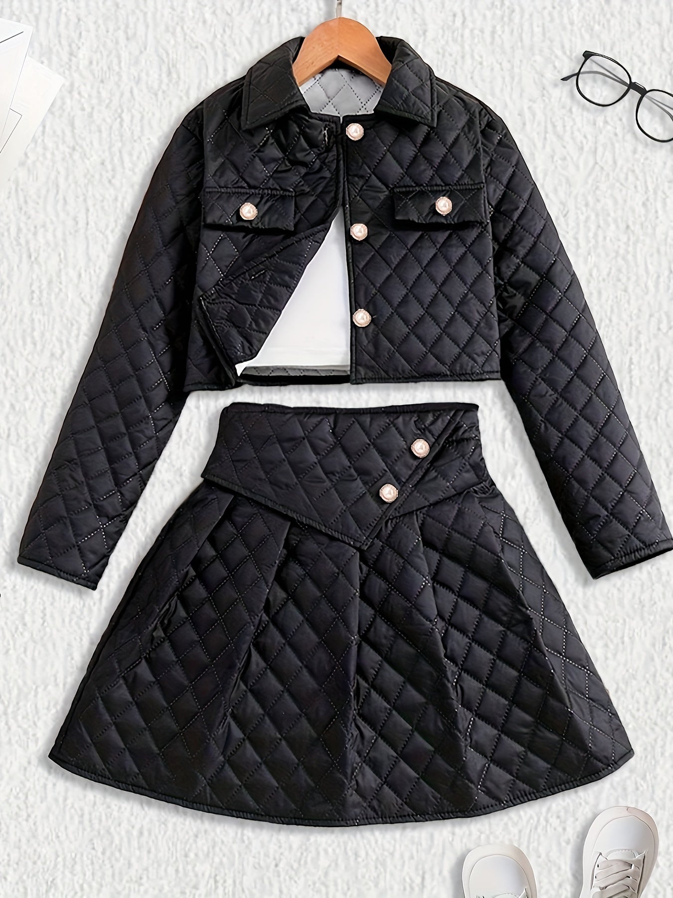 A cozy two-piece winter set featuring a short jacket and matching A-line mini skirt. Designed with a tweed-like texture and golden button details, offering a polished look for casual outings and special occasions.