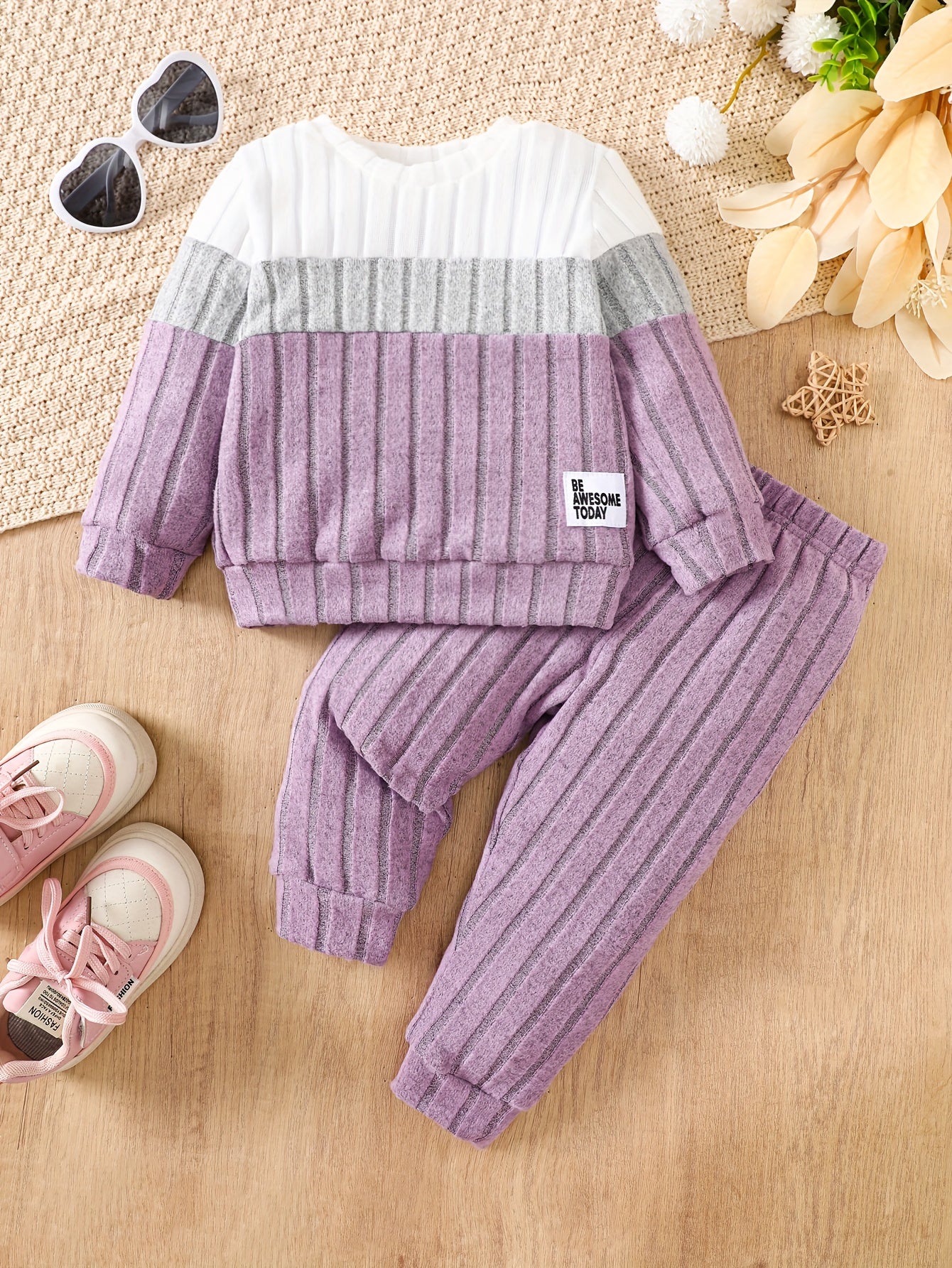 A cozy autumn and winter two-piece outfit designed for baby girls, inspired by European and American seasonal style. Featuring a brushed ribbed long-sleeve top and matching long pants, this set offers warmth, comfort, and everyday ease.