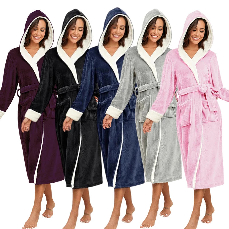 A high-quality bathrobe designed for women with a soft and cozy feel. Made from heavyweight flannel fleece for warmth and comfort. Ideal for home wear during winter.