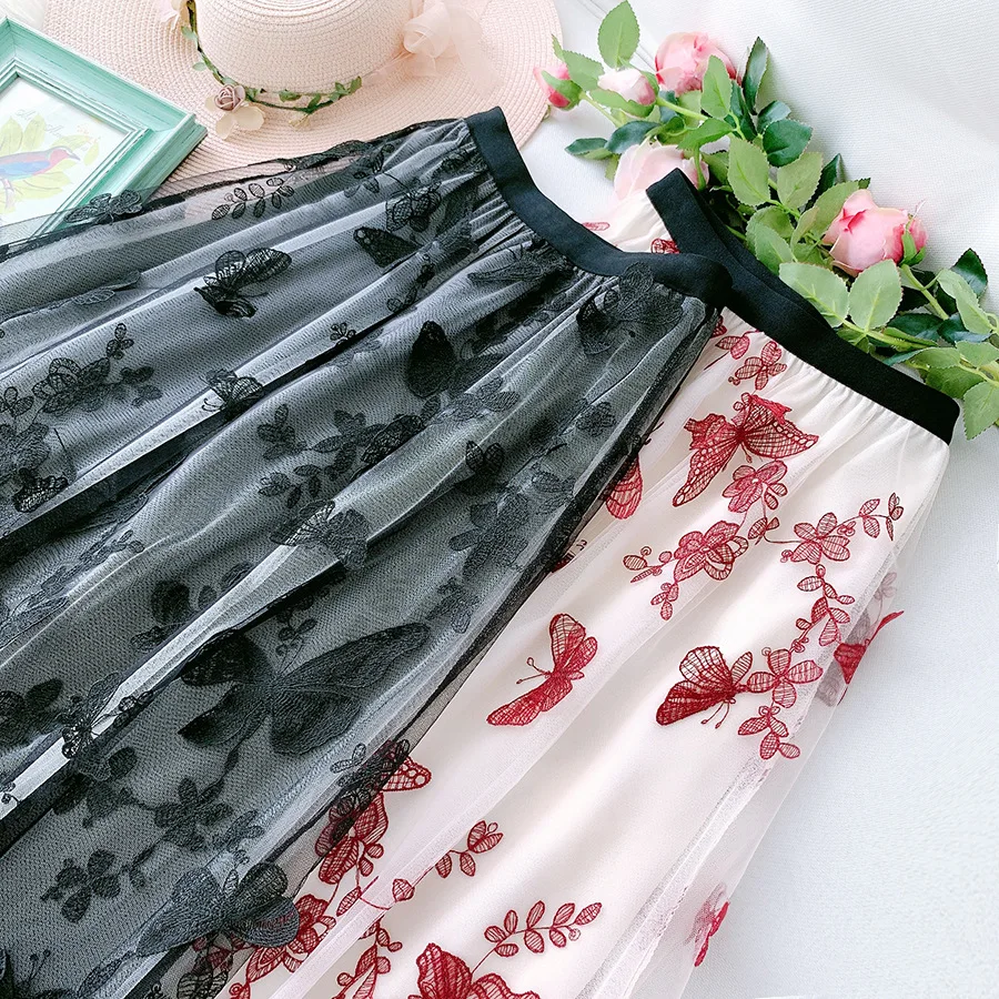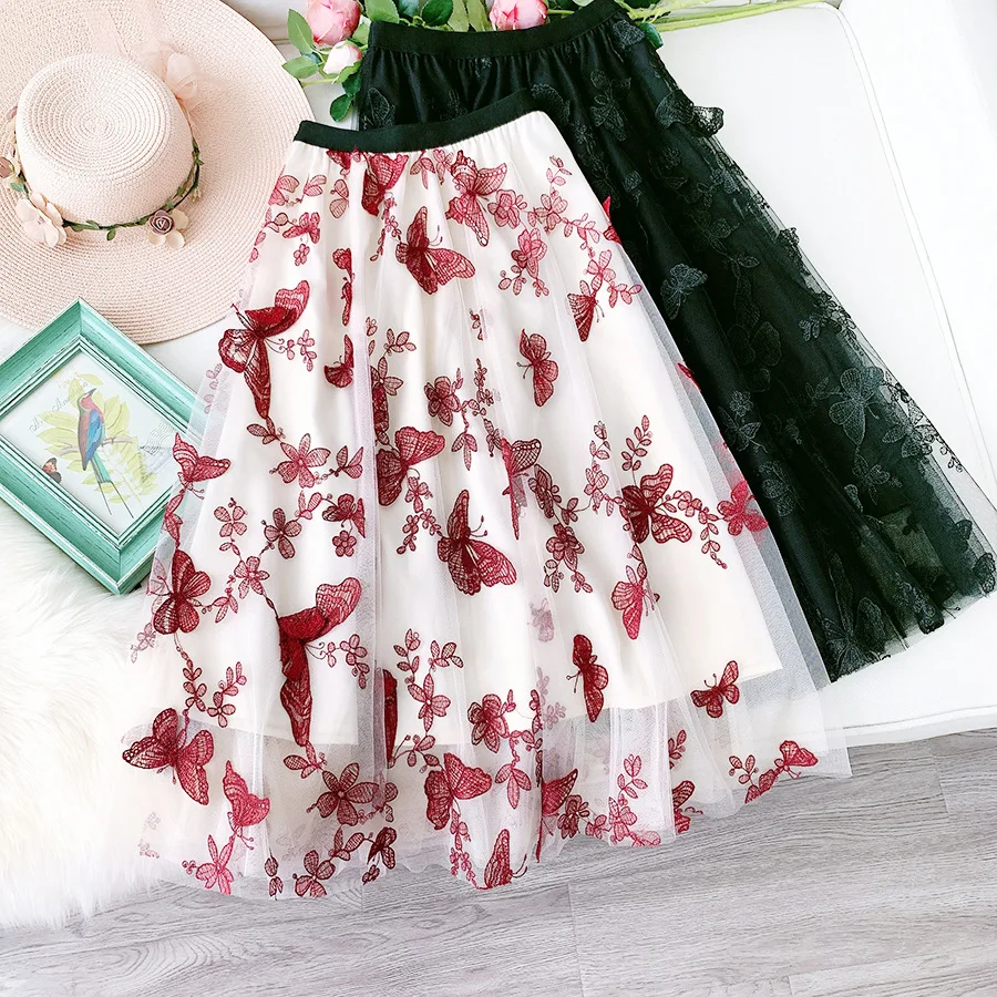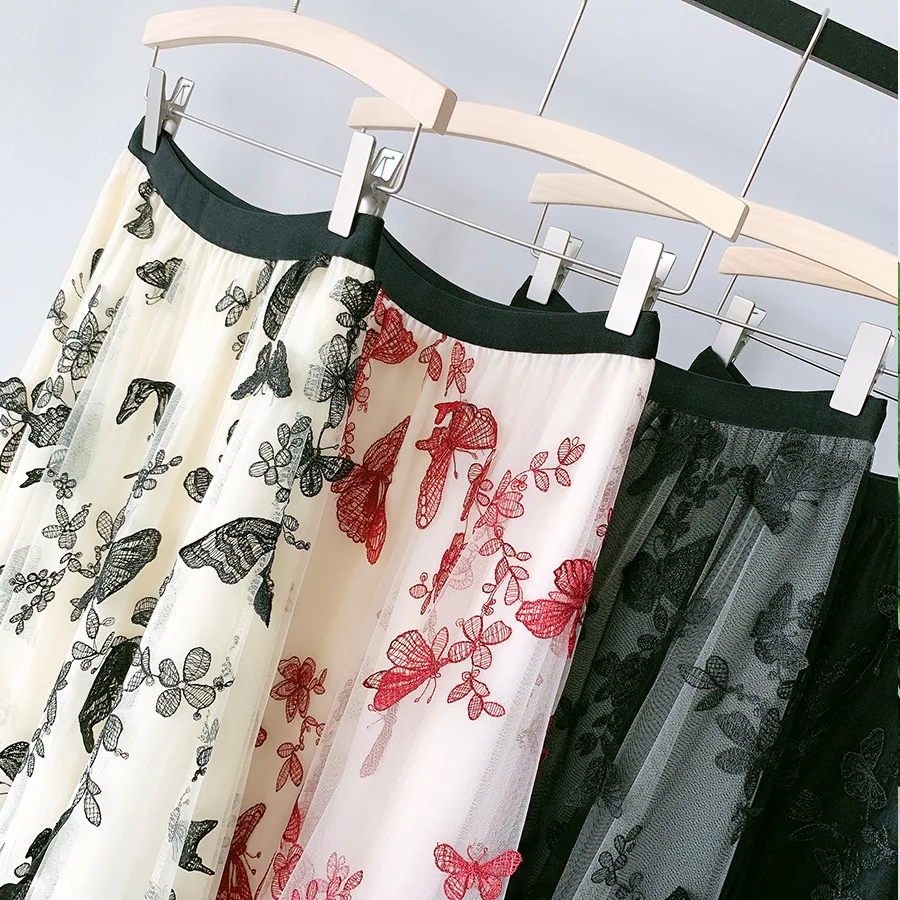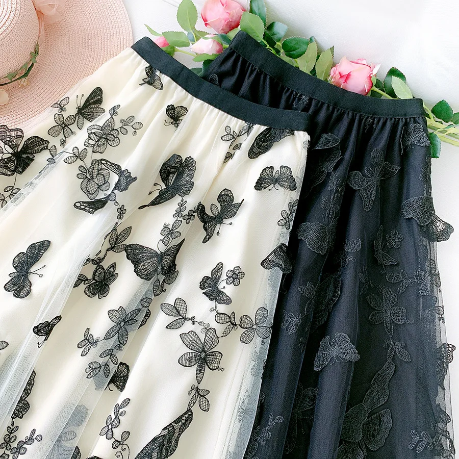Butterfly Embroidered Women Skirts Long Mesh A-Line Tutu Skirt 2023 New Heavy Work Fairy Tulle Skirts for Women Faldas Saias