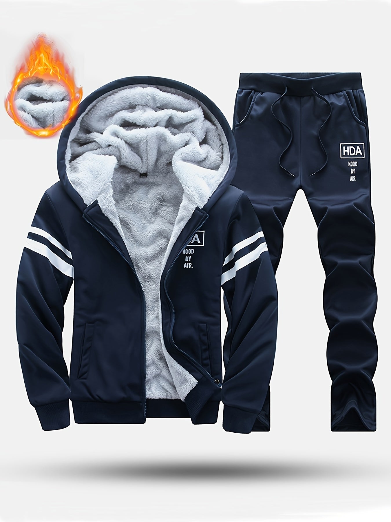 A casual two-piece sports set designed for everyday comfort and outdoor wear. Features a hooded jacket paired with matching jogger pants for cooler seasons. Suitable for autumn and winter activities.