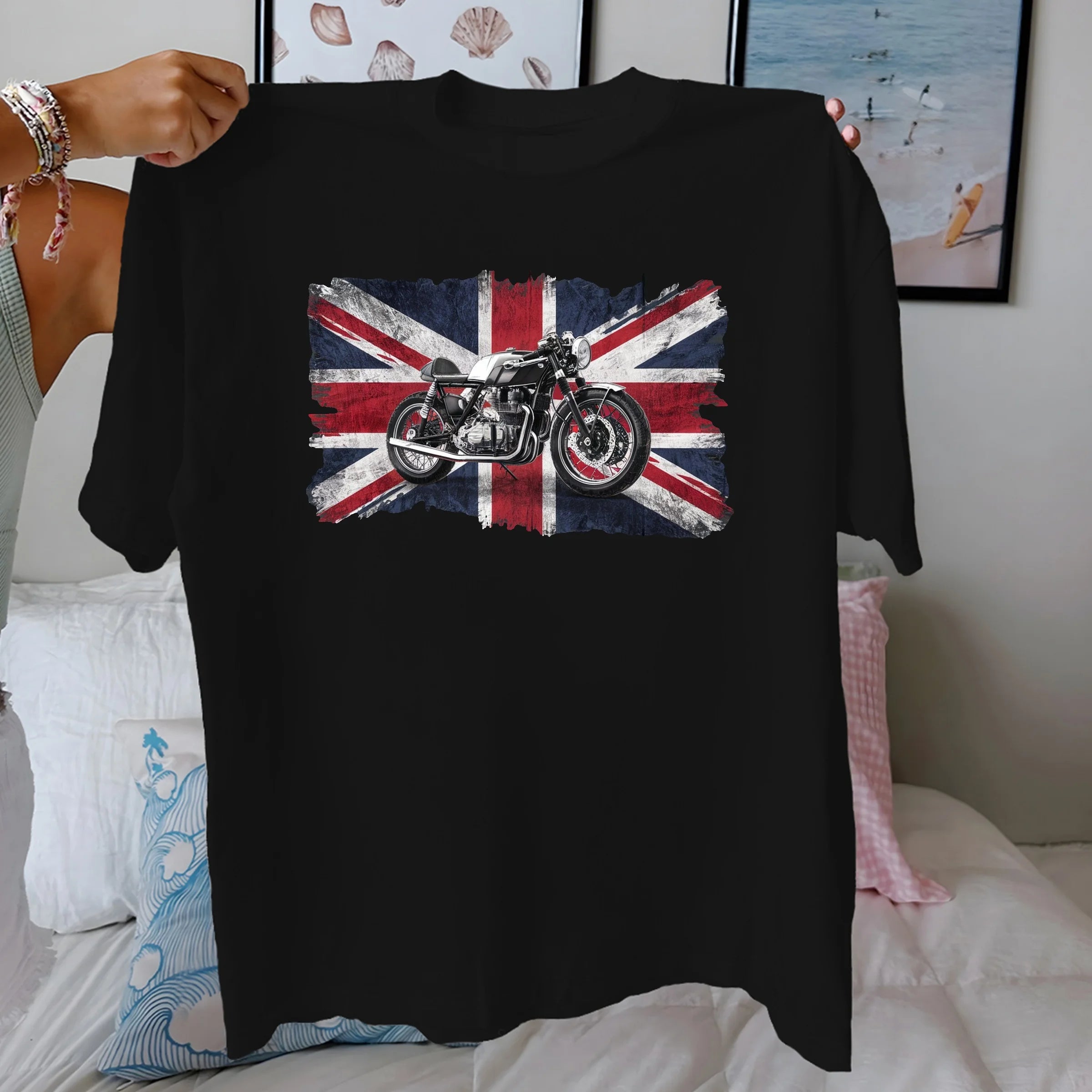 A comfortable pure-cotton T-shirt featuring a classic café racer motorcycle flag graphic. Made from soft 180gsm knitted cotton, designed for relaxed everyday wear with a vintage-inspired casual style.
