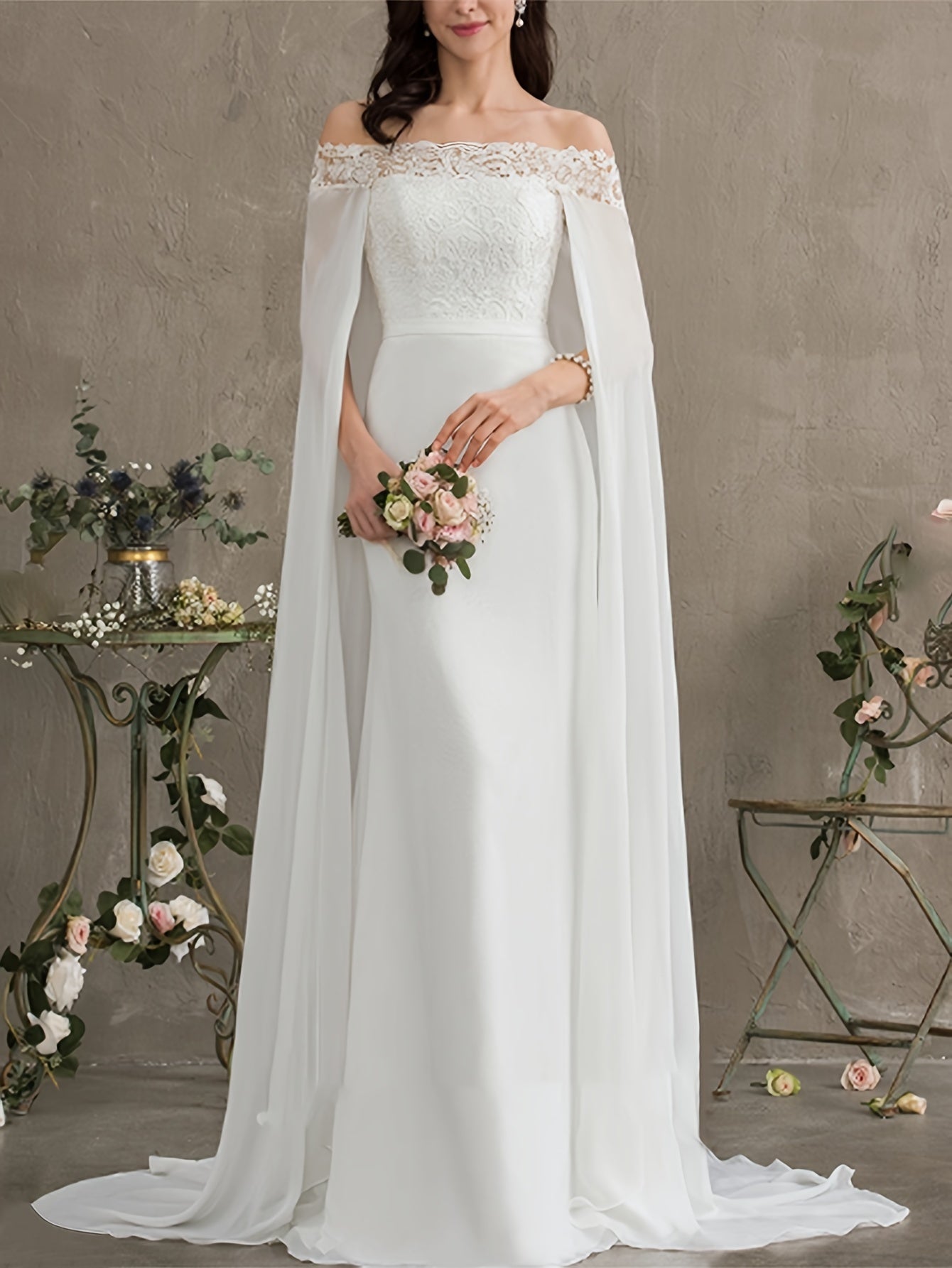 The off-shoulder neckline and cape-style lace detail create a dramatic silhouette.
