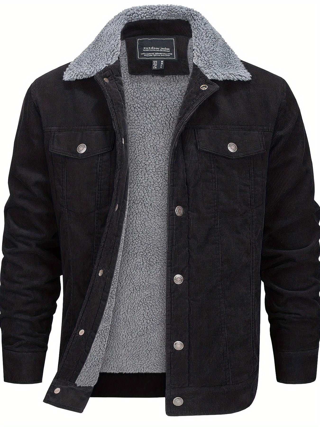 A warm corduroy winter jacket lined with plush sherpa for essential cold-weather comfort. Designed with a trucker-inspired lapel collar, multiple pockets, and a durable cotton build for everyday and outdoor wear.