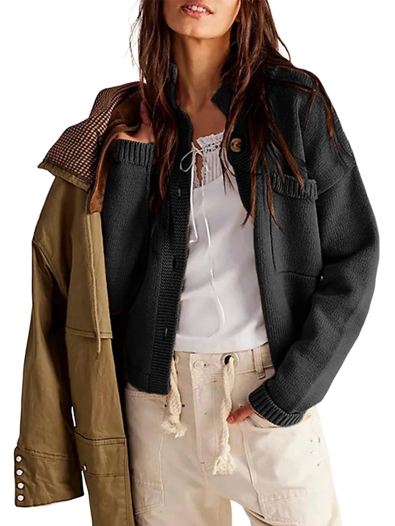 A warm knitted cardigan designed for autumn and winter layering. Cut with a loose fit for relaxed comfort and everyday wear. Styled with a solid finish for versatile seasonal use.