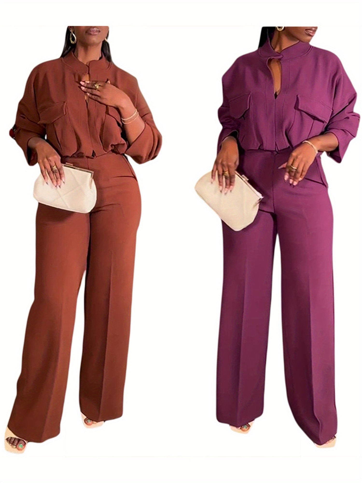 The long sleeve V-neck top pairs with wide leg pants for a balanced silhouette.