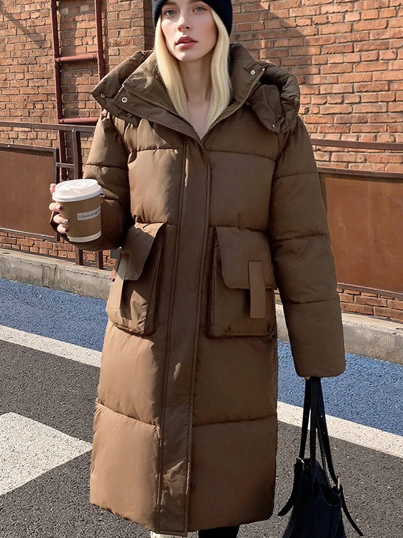 An elegant mid-length puffer coat designed for winter warmth with a clean, versatile silhouette. Finished with a hooded collar and chest pocket, it offers comfortable insulation for everyday and semi-formal wear.