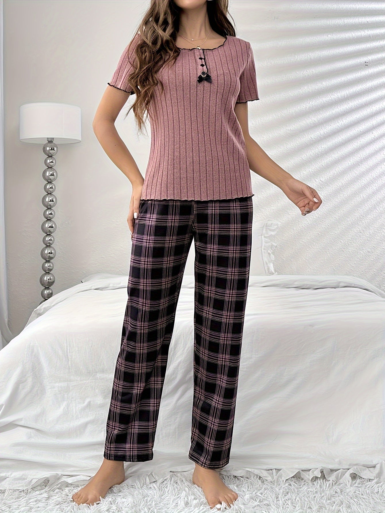 A lightweight pajama set designed for women with a soft and relaxed feel. Styled with a plaid print and gentle stretch for everyday comfort. Suitable for sleep and lounging across all seasons.